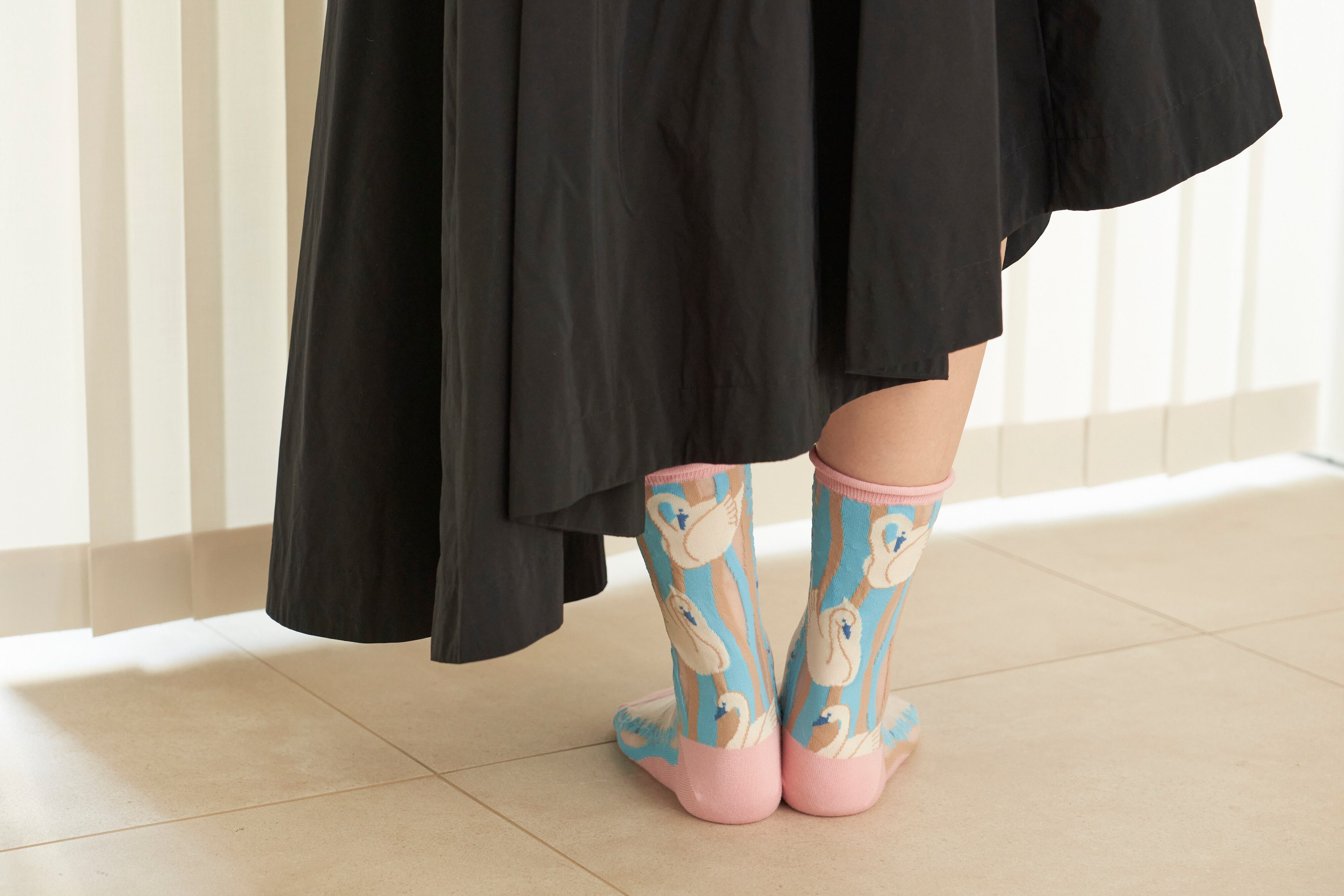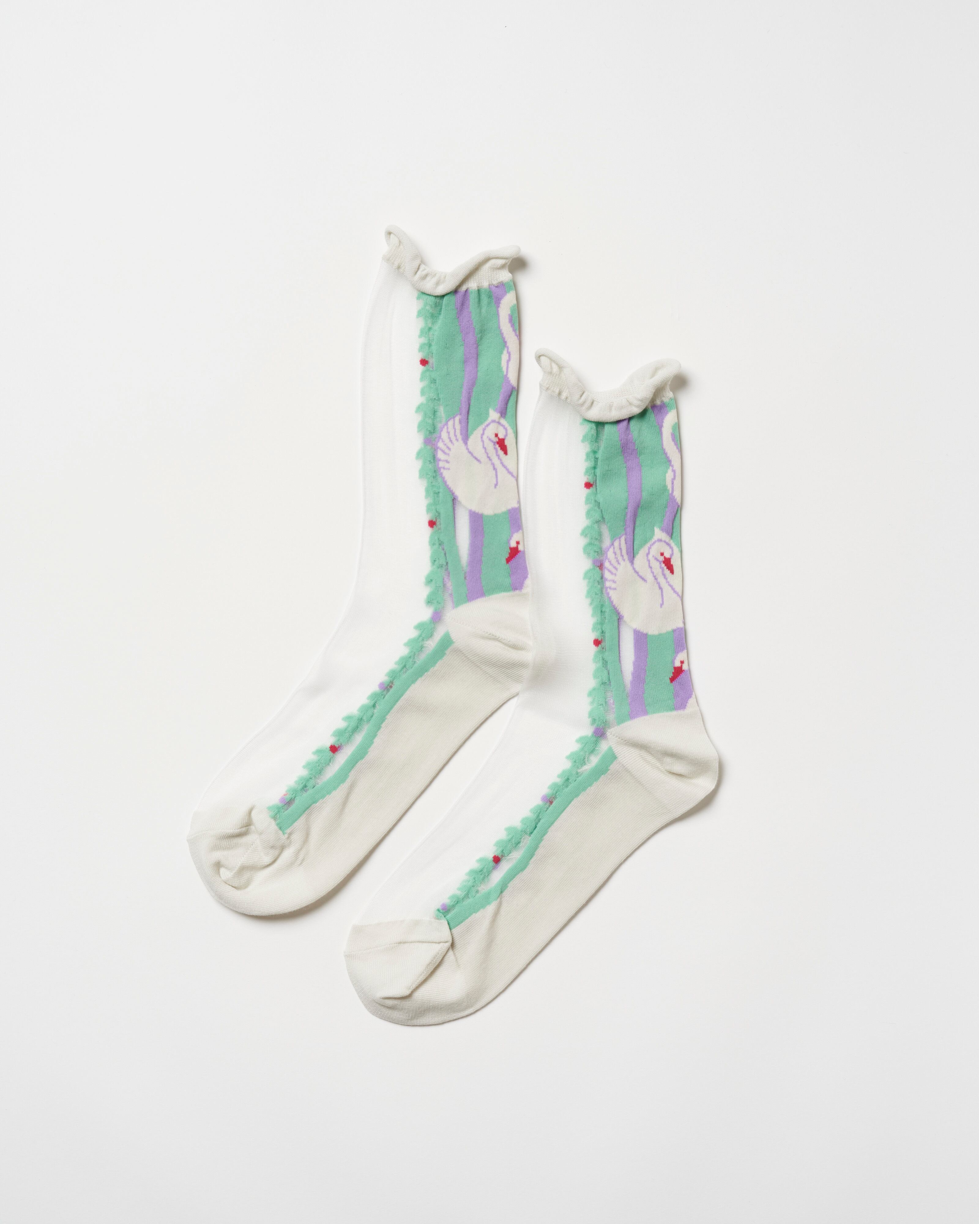 フィンランドの国鳥であるスワンをモチーフにした美しいソックスです。正面は爽やかなシースルーになります。