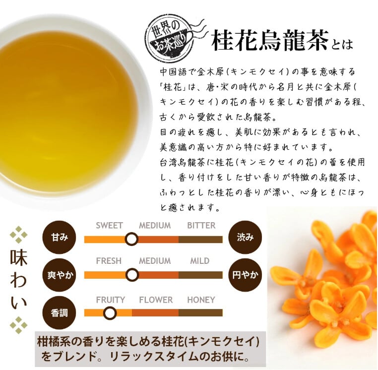 ●凍頂烏龍茶にキンモクセイの花びらをブレンドしました。●苦みが少ない味わいです。●くずれた細かい茶葉を使用している分、価格もお得で水出しが早いタイプです。
